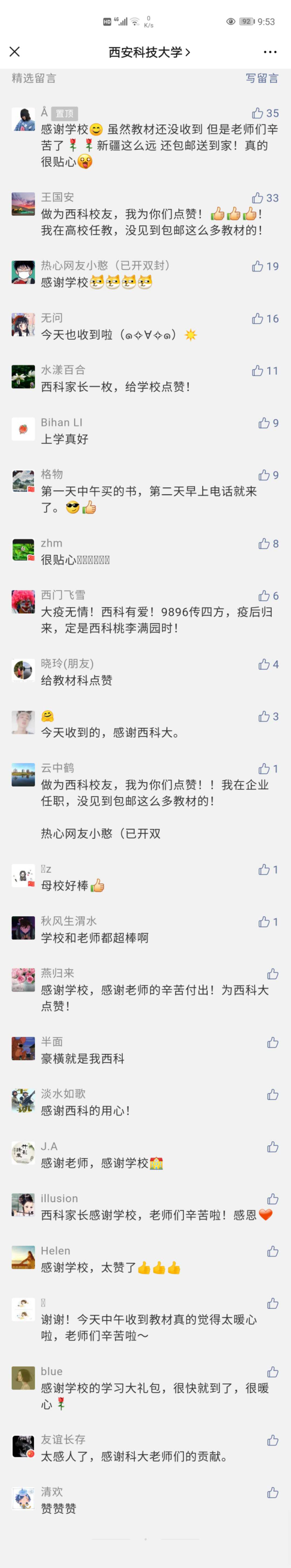 目前,学生已经陆续收到了教材,不论是对线上教学的授课效果还是学生对母校的感情都得到了进一步提高,学生收到教材时温暖的留言就是对学校最高的褒奖。
